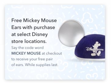 All you have to do is use the code words “Mickey Mouse” at checkout with any purchase and voila! You have a brand new set of Mickey ears! Disney notes that this offer is only available at select Disney Store locations, so be sure to give your local store a call before you head out.