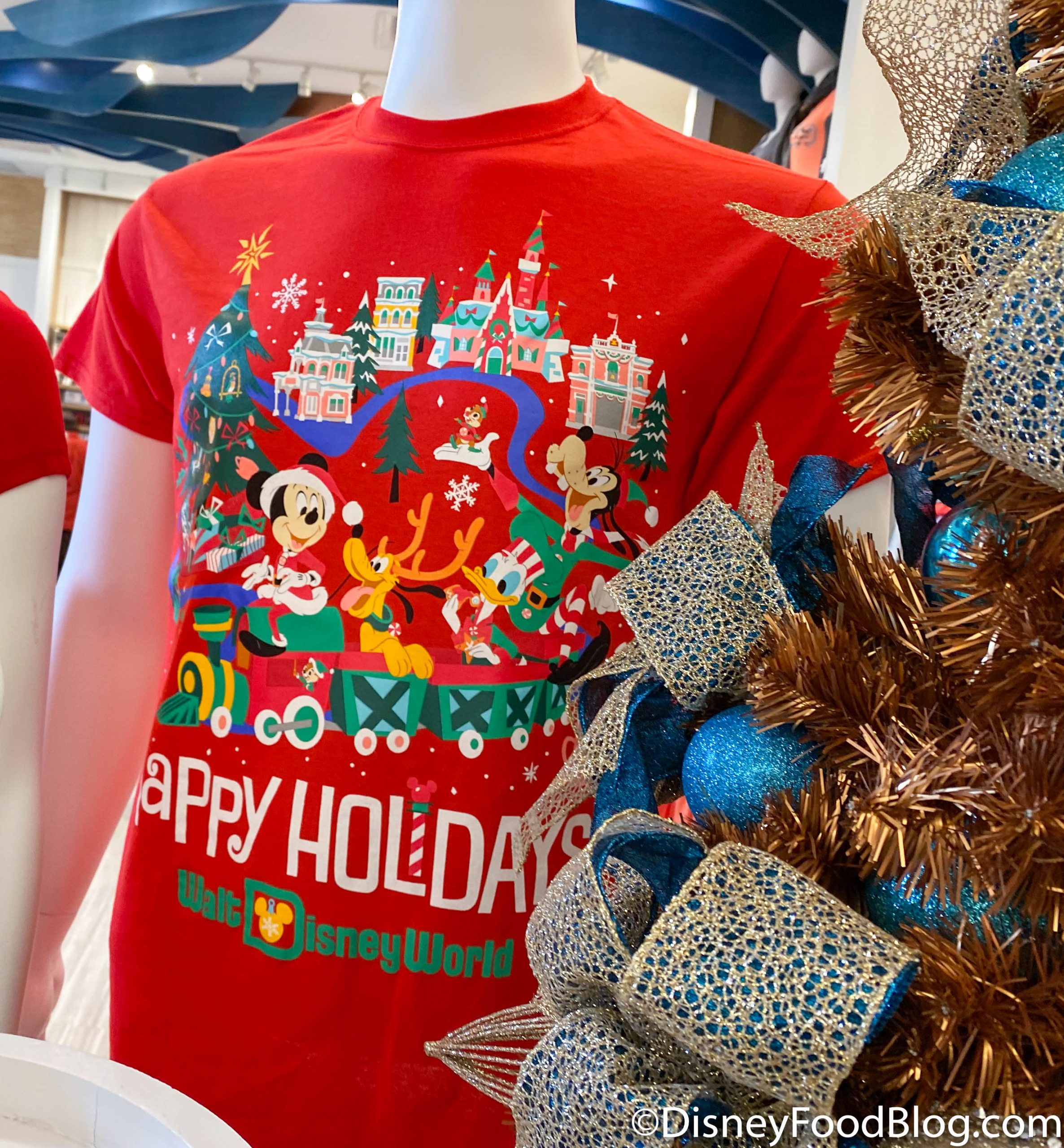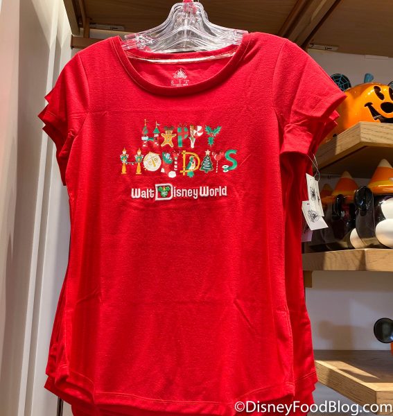 We also spotted two holiday shirts. First, there’s this Disney Parks Icons Happy Holidays T-Shirt, where the letters are made out of all kinds of holiday and Disney icons like the little smiling face from “it’s a small world” and more! And yes, those are Halloween items right next to this holiday shirt — we’re celebrating ALL the holidays!