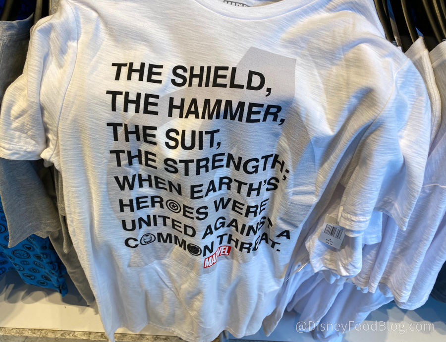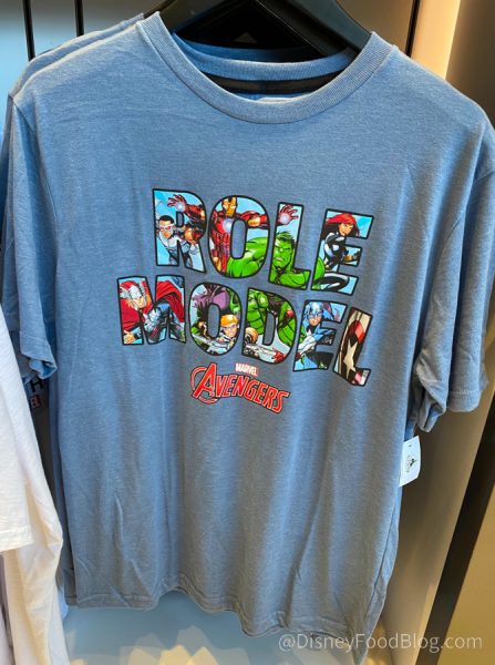 The Avengers Assembled for some new clothing we spotted at Keystone Clothiers. It is Marvel Mania month, after all, and Disney has been releasing a lot of new Marvel merch. First, we spotted this gray Avengers Role Model T-Shirt that features the Avengers in the letters of the words.