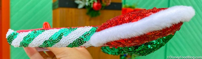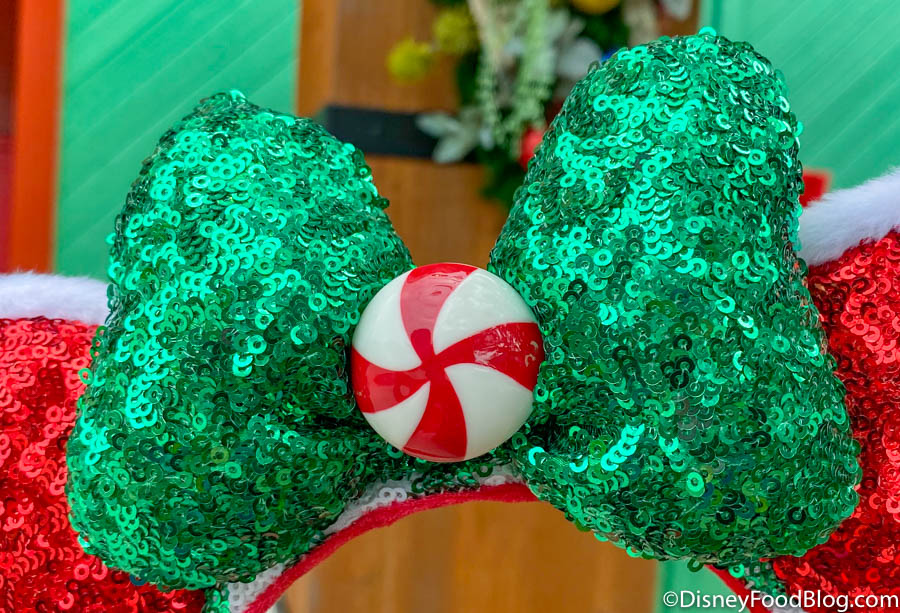 These ears are ALL blinged out with red sequins and faux fur! They’re giving us more Santa vibes than peppermint — either way, they’re mega festive. This is our favorite part — the puffy bow is bright green sequins with a peppermint candy center!