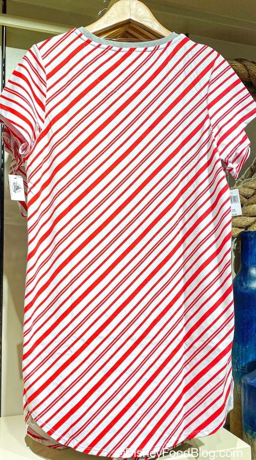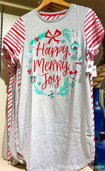 We’re talkin’ nightgowns, and we found some cute new PJs at the Market at Ale and Compass in Disney’s Yacht Club Resort! This nightgown says the words “Happy, Merry, Joy” in red over a gray background with Mickey-shaped ornaments and greenery that looks like mistletoe?!