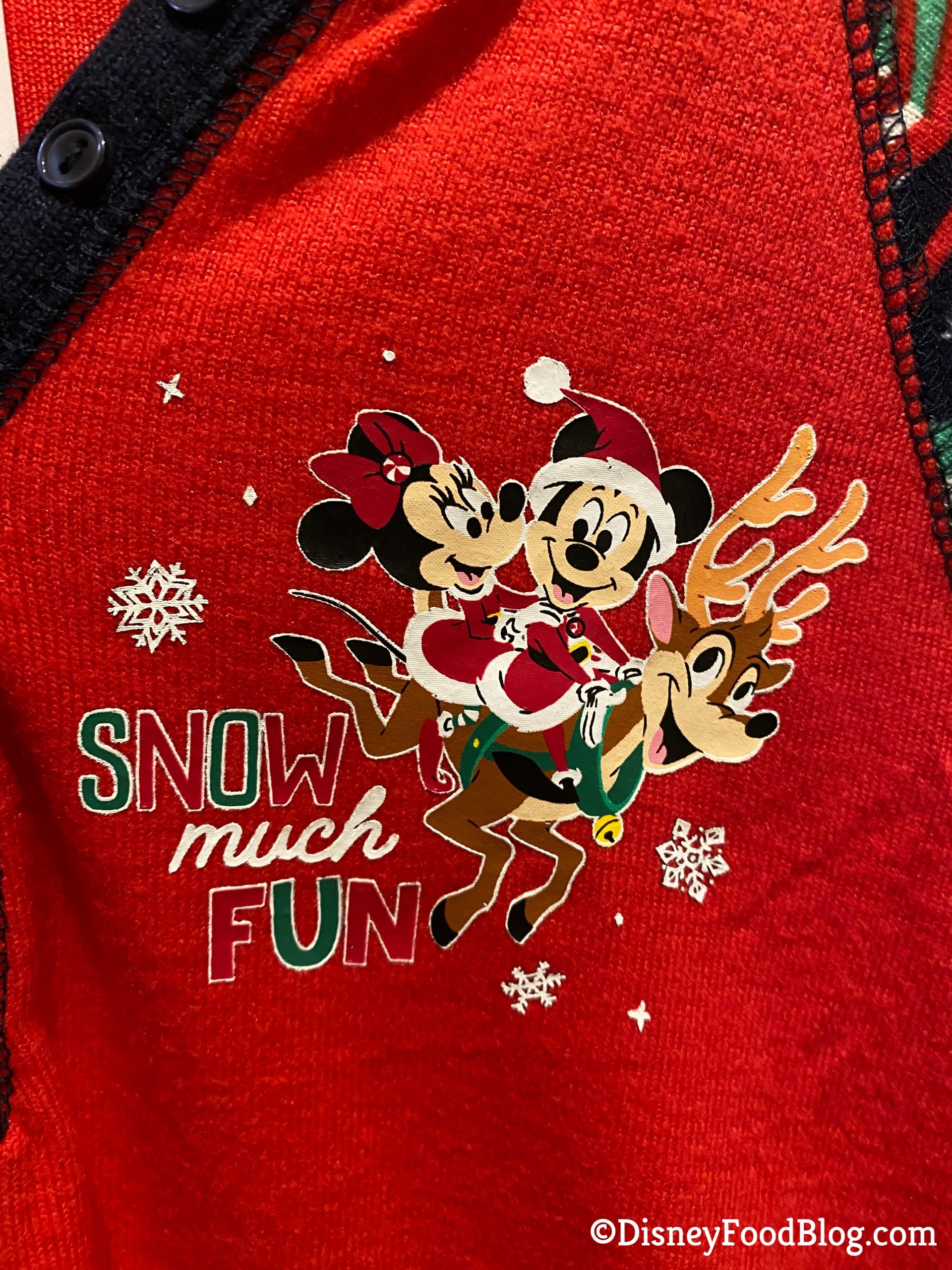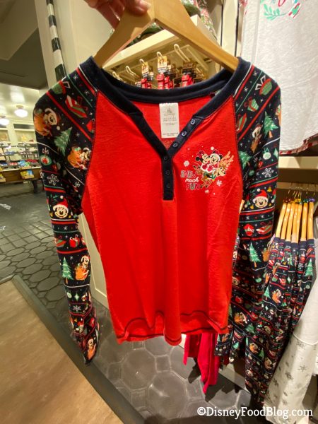 We ALSO found this new Festive Pajama Shirt. The sleeves are covered in trees, gifts, and Mickey in a Santa hat of course! This has got us feeling holly and jolly!