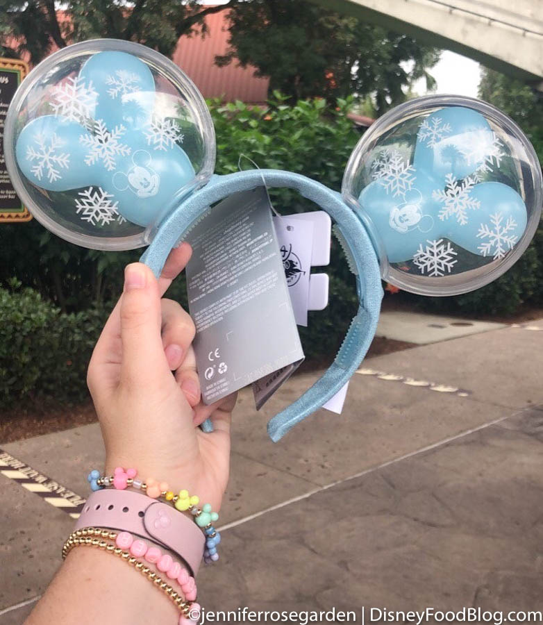 Now, we’re introducing the new Snowflake Mickey Balloon Ears! The ears have a light blue headband, with matching light blue Mickey balloons, and the clear globe surrounding it is covered in snowflakes! Even though we’re in Florida, these ears have us dreaming of snowy winter days already.