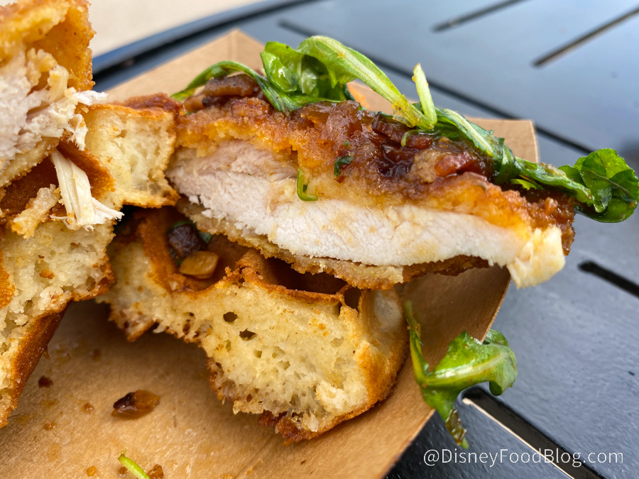The chicken reminds us a lot of the chicken served at The Citrus Blossom Booth at the EPCOT Flower & Garden Festival. It’s really fresh and crispy. There’s a slight kick from the syrup, thanks to the sriracha, and we wanted even more of it! This was so good that we might count it as a festival fave! You can try it out for yourself for $6.50.