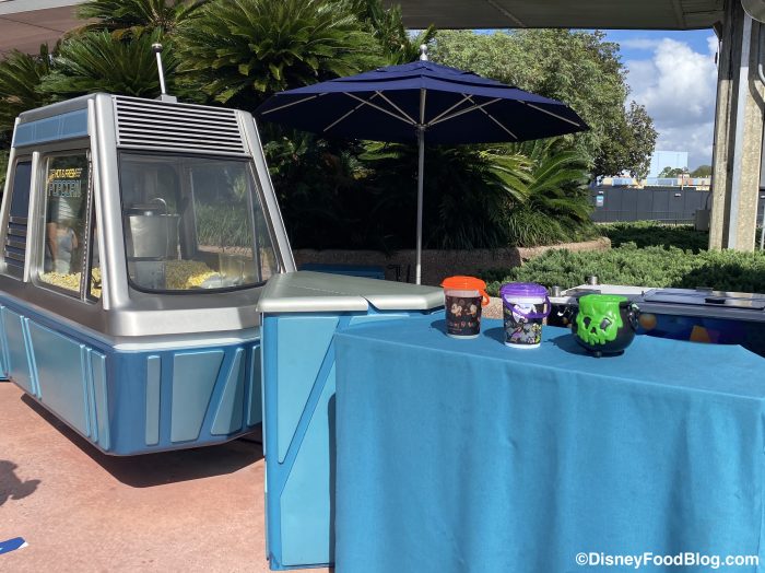 We spotted the glow-in-the-dark popcorn bucket at EPCOT as well! It’s the one with the orange lid and handle in the photo below.