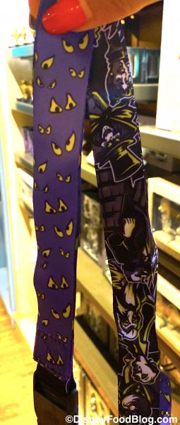Over at the Haunted Mansion gift shop Memento Mori, this Haunted Mansion Lanyard was new to us. It’s a reversible lanyard that features spooky eyes on a purple background on one side, and several characters from the attraction on the other!