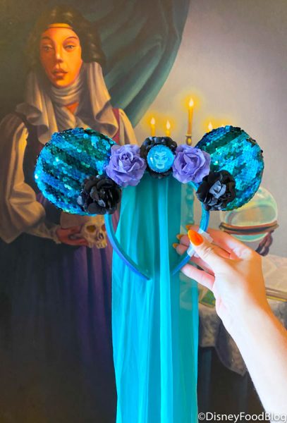 We wouldn’t say it was worth it necessarily, but this merch is pretty cool. The ears feature Madame Leota surrounded by black and purple flowers. They also have a tealish-colored veil that honestly gives us more Constance Hatchaway vibes than Leota vibes. Not gonna lie, we’d personally like these more if they’d just hatch that veil away.