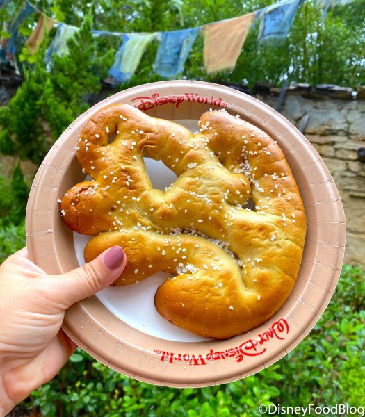 To begin our food tour of Animal Kingdom, we stopped by two food kiosks. The first was Harambe Market, a kiosk known for selling fresh fruit, trail mix, and other snacks. This location also serves soft pretzels, however we noticed something different about these pretzels…