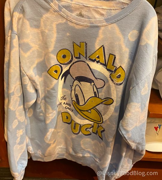 Donald Duck gets some love on this cloudy blue (look at the Mickey-shaped clouds!) on this Retro Donald Duck Sweatshirt. We are LOVING it.