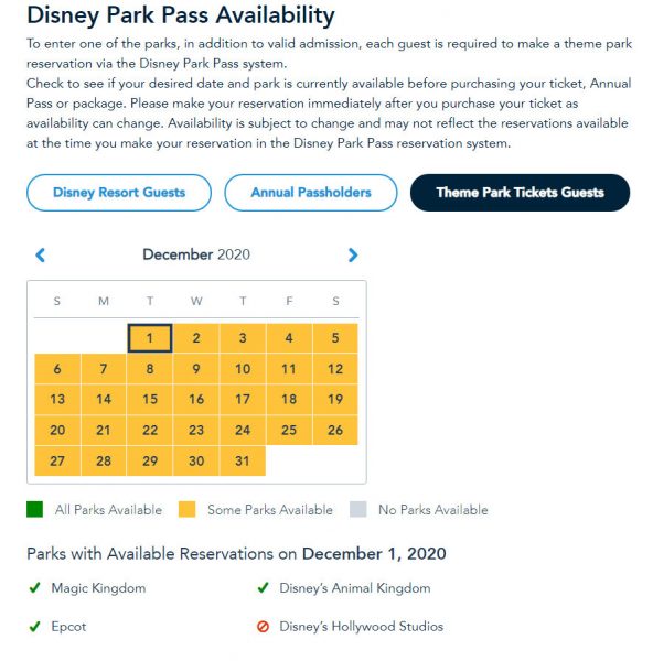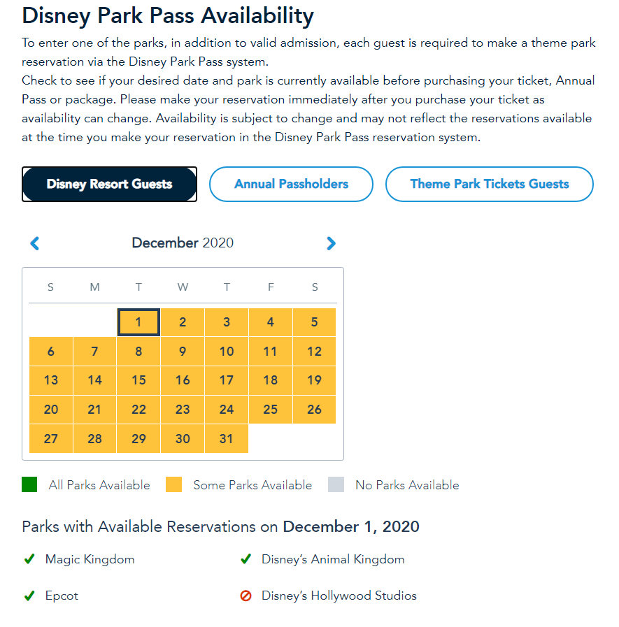We often check park pass availability and we’ve already seen a lot of November dates fill up, but now December is getting full, too, ESPECIALLY at Hollywood Studios. When we recently checked availability for passes, we noticed that EVERY single day, with one exception, was full for Studios for Theme Park Tickets Guests: