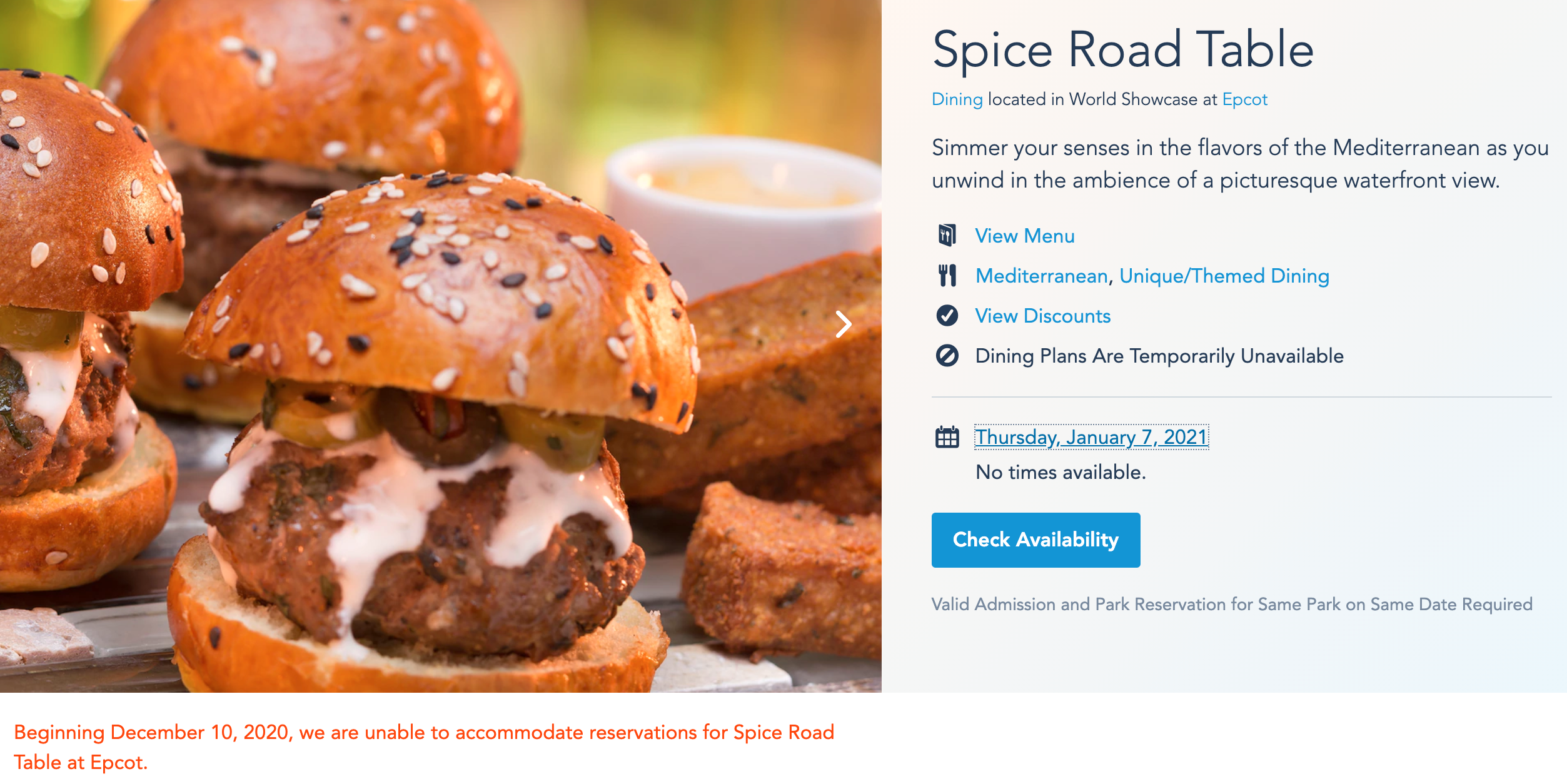 According to its page on the Disney website, Spice Road Table is “unable to accommodate reservations” starting December 10th.