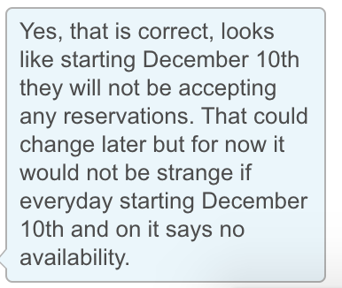 The hours for the restaurant are also listed as “No Times Available” from December 10th through the end of the calendar (January 7th).