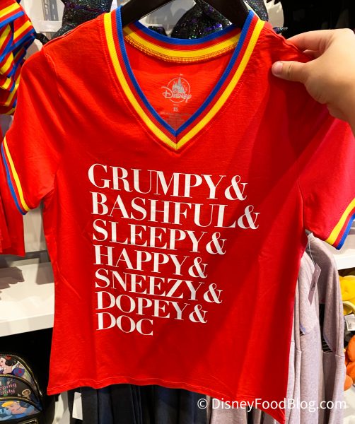 The Dress Shop was also full of new merchandise! This is your go-to destination for trendy Disney style! For a more casual look, we spotted some new tops! First up is a pair of Snow White-inspired shirts. This cute t-shirt with all of the dwarfs’ names retails for $36.99.