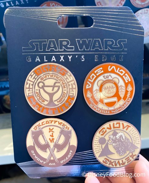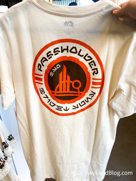We found a collection of new t-shirts, pins, and other collectibles from the Star Wars: Galaxy’s Edge Trading Outpost, which recently took over WonderGround Gallery in Downtown Disney. The first t-shirt we spotted is actually an Annual Passholder-exclusive t-shirt in the style of one of the coasters you receive when visiting Oga’s Cantina. This t-shirt retails for $36.99.