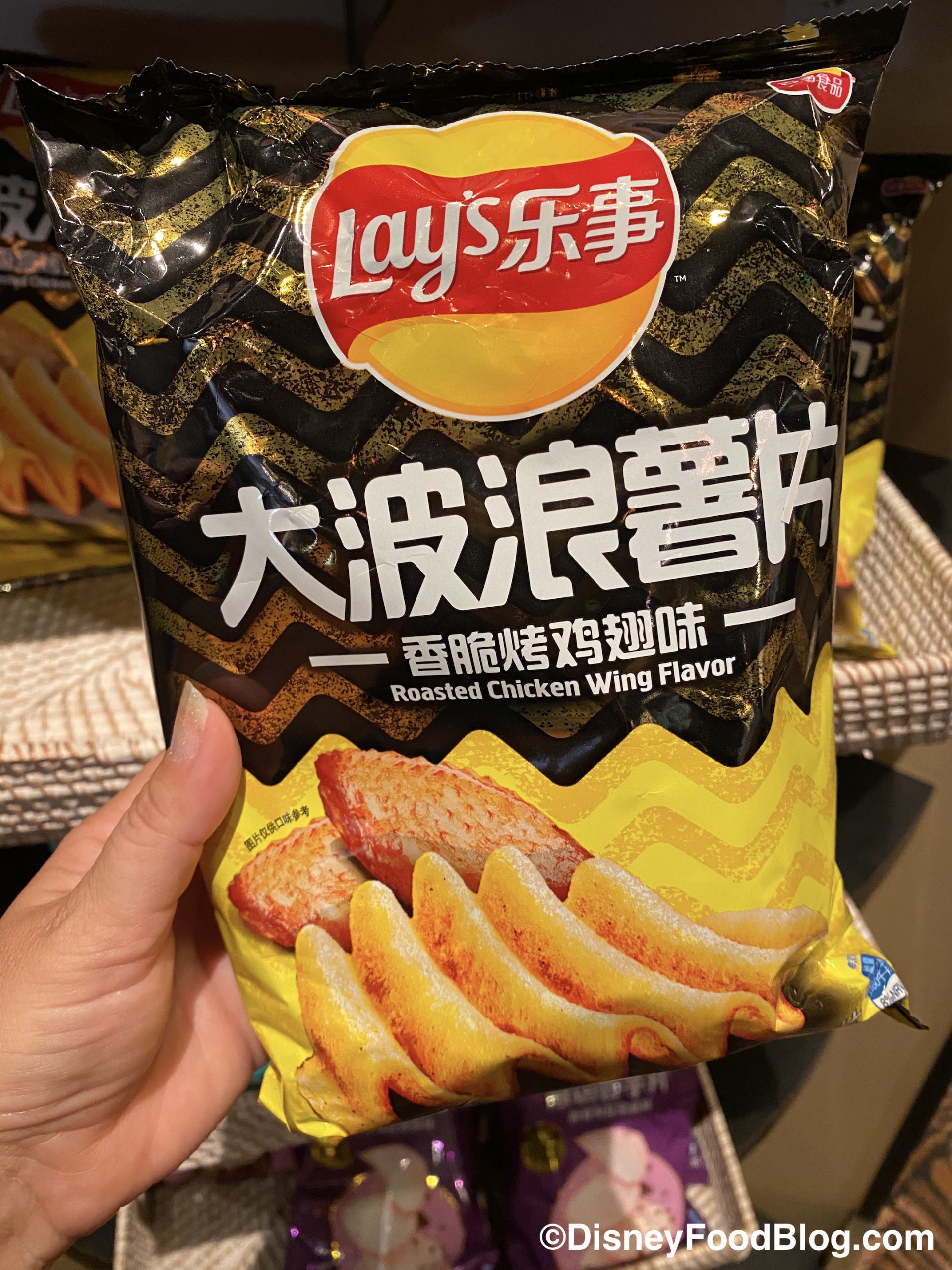 That wasn’t the only interesting pre-packaged snack we found. Over in the China Pavilion, we spotted these Chicken Wing Lays Potato Chips!
