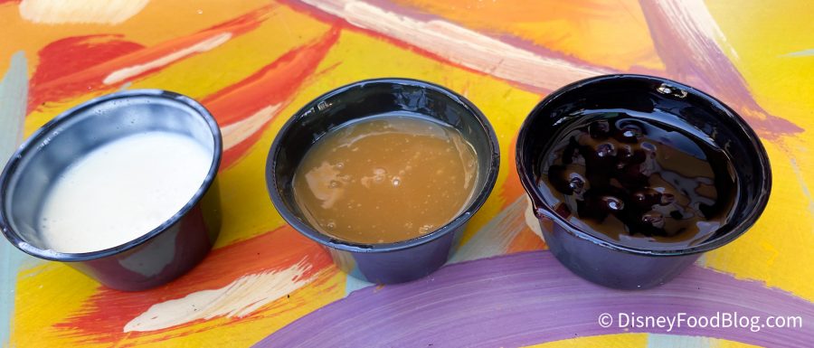 In addition to their classic (and to-die-for) chocolate dipping sauce, you can sample Praline-Maple Anglaise, Caramel Apple, and BOO-Berry. So, naturally, we got all three of them.