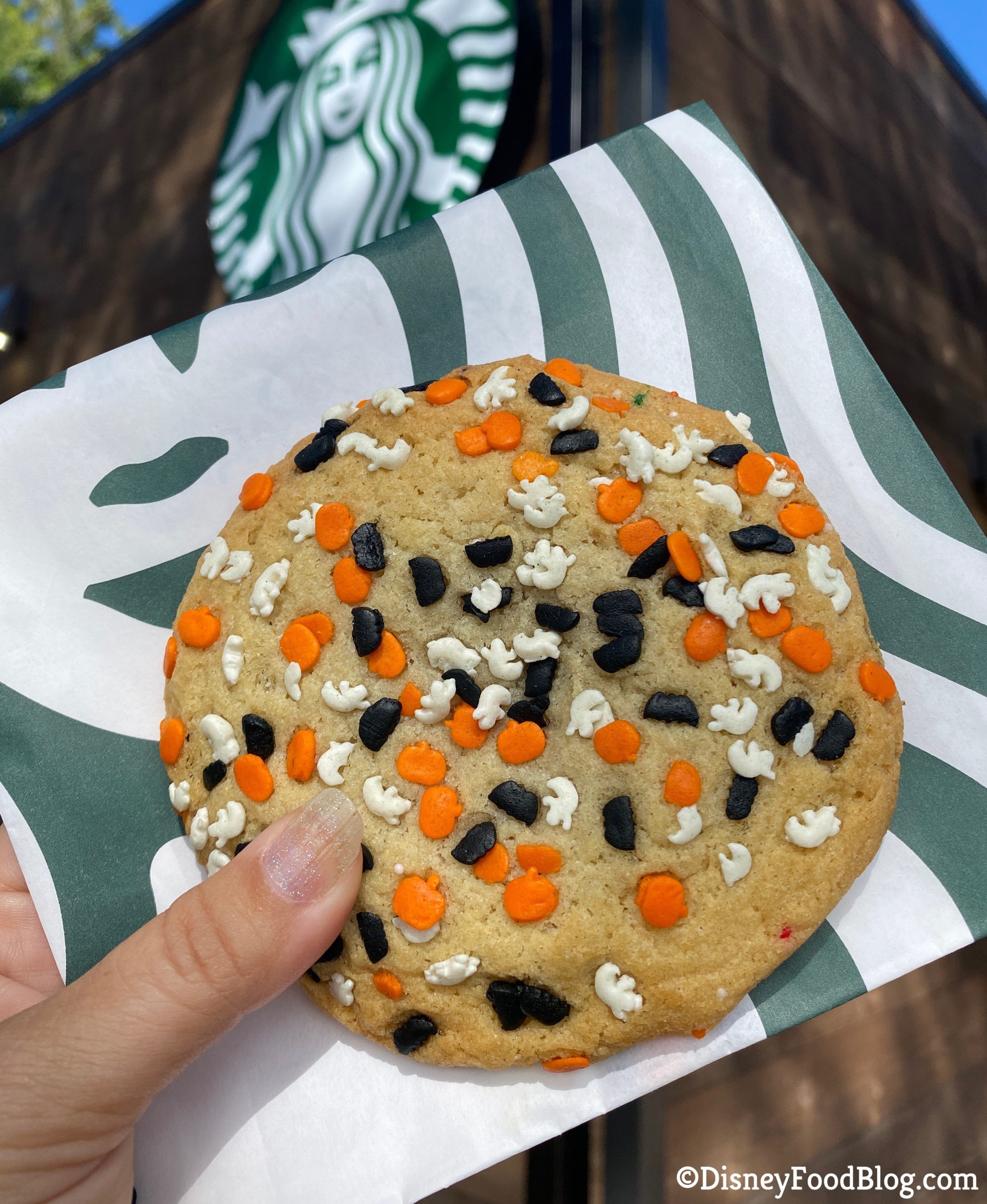 We’d like to turn your attention to the very festive Halloween Sugar Cookie. We grabbed this over at Traveler’s Cafe, also known as the Starbucks location in EPCOT. When he heard that this cookie was merely a sugar cookie topped with Halloween sprinkles, we felt a little unimpressed. How different could a sugar cookie with sprinkles be? Will it compare to the GIANT sugar cookie that stole our hearts earlier this month? And, is it worth spending the cash when EPCOT is hosting an entire festival dedicated to food right now??