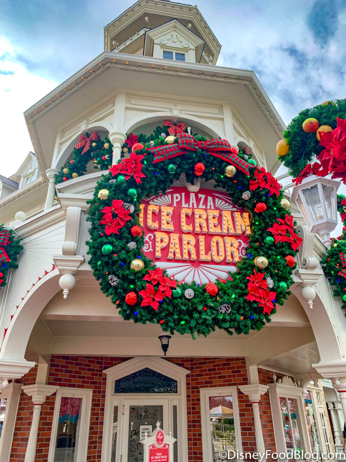 The Plaza Ice Cream Parlor is sporting one of the BIGGEST wreaths on Main Street.