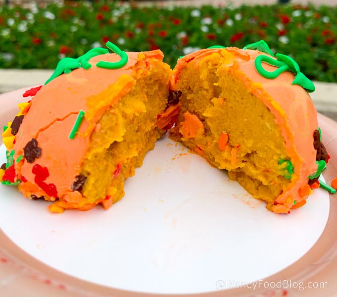 Imagine yummy buttercream icing flavored like pumpkin pie — nice, right? The pumpkin spice flavor here is strong (as we like it!), and the cake pop is soft AND gooey on the inside. This is the PERFECT fall treat for pumpkin lovers! It’s like pumpkin pie and cake all in one! The cake pop is $7.99. (FYI, they also still have the Jack Skellington cake pop so you can choose your overlay.)