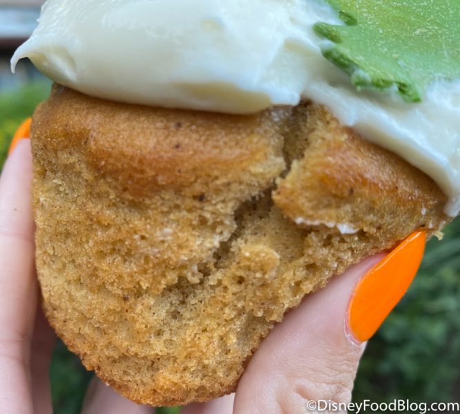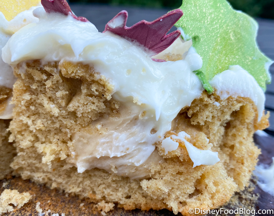 The cupcake is full of flavors you probably expect from a Thanksgiving-themed treat! It’s a vanilla cake made with a pumpkin spice flavoring. Since it was made with flavoring, the pumpkin spice didn’t come through super strong.