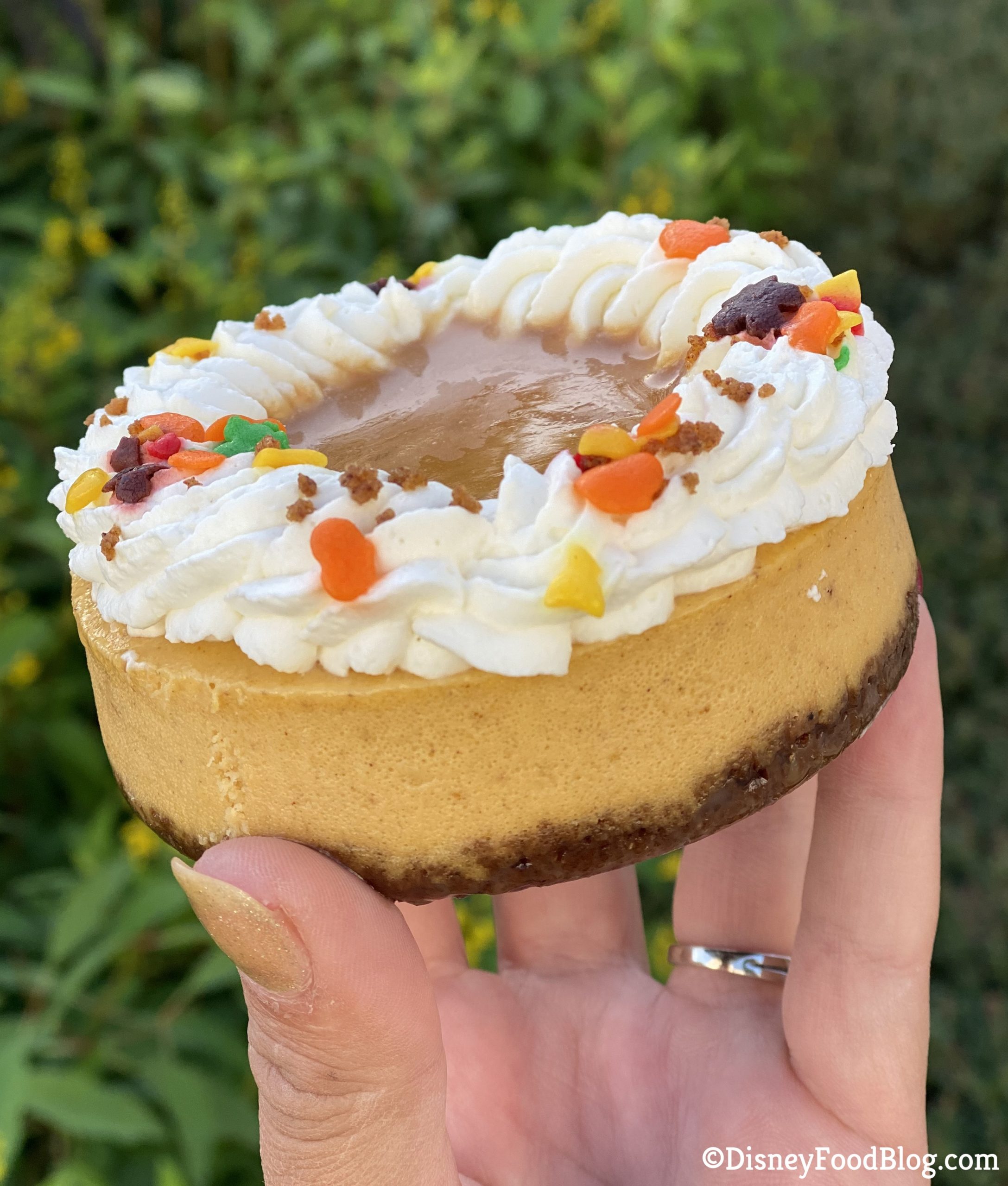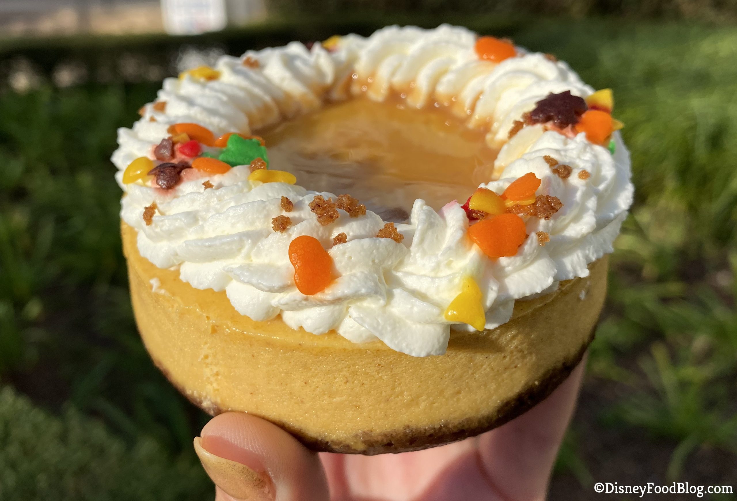 This treat is made of pumpkin cheesecake with a gingersnap crust and topped with whipped cream and fall sprinkles. It’s pretty cute!