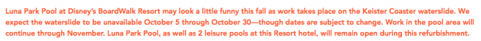 Previously, Disney had announced that the waterslide would be unavailable from October 5th through October 30th, though those dates were subject to change, and that work in the pool area would continue through November.