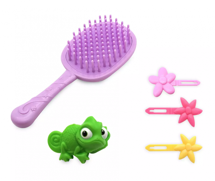 The playset also comes with some accessories, including flower hair clips, a Pascal clip, and a Tangled themed brush.