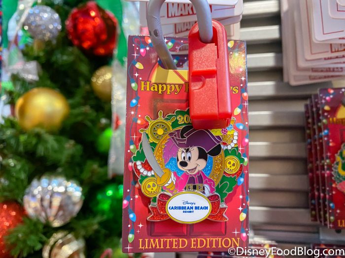 In terms of the Moderate resorts, we found a pin featuring Minnie Mouse dressed as a pirate and ready to have a swashbuckling good time over at Disney’s Caribbean Beach Resort for the holidays!