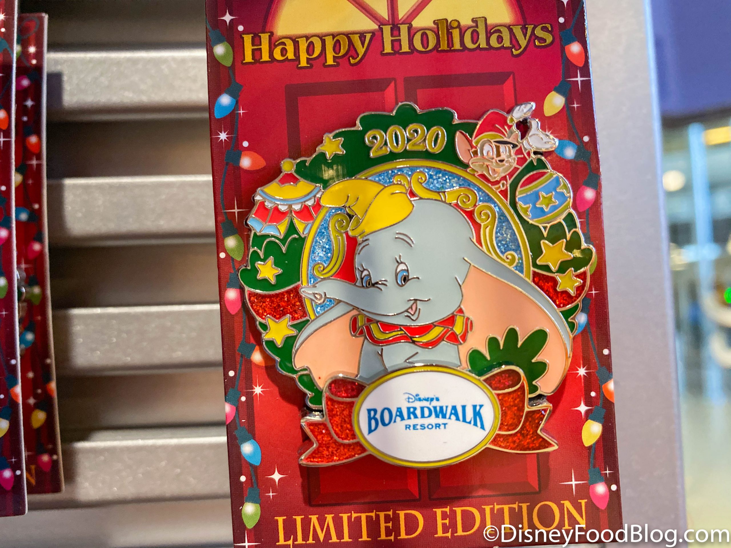 Or, you can opt for this cute pin featuring Dumbo and Timothy Q. Mouse having a jolly holly holiday over at Disney’s BoardWalk Resort.