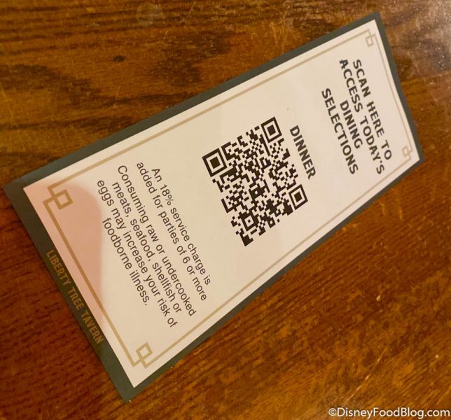 One thing that we see a lot in a reopened Disney World is the absence of physical menus. Instead, you’ll likely find a little card on your table with a QR code that will take you to the virtual menu by pointing your phone’s camera at it.
