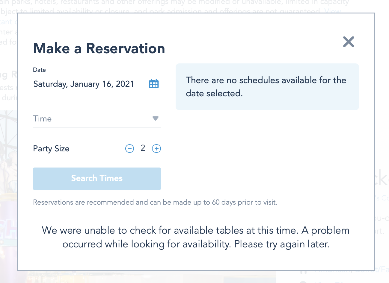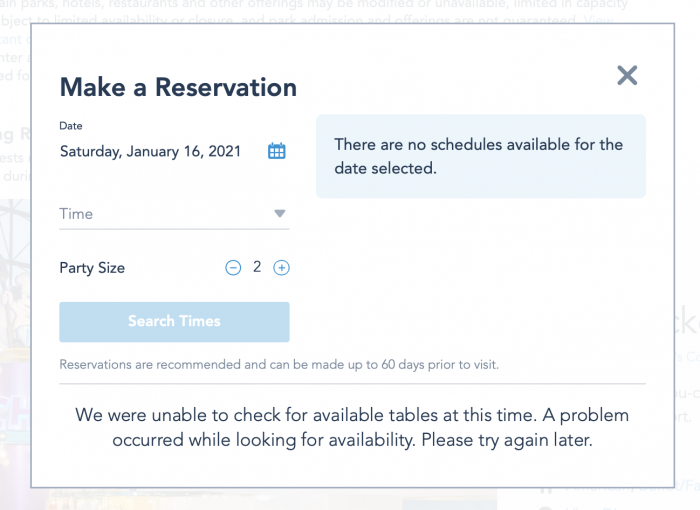 Of course, we kept trying. We were able to get the pop-up to close and to select the number of people and the date and time before we were shown another error message. This one notes that access to the reservation servers is unavailable.