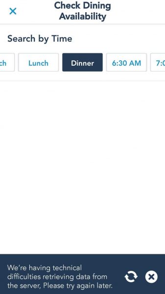 Then, as the morning went on, reservations became completely unavailable all of a sudden! Despite the Disney site still noting that dining reservations are available online, we’ve been seeing this error message on every dining-related page.