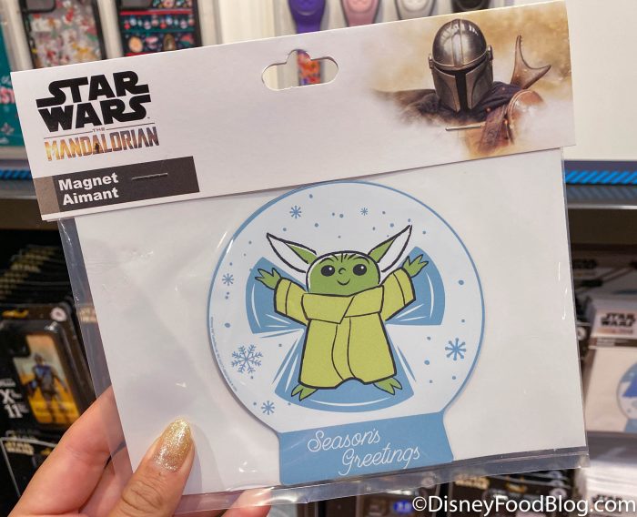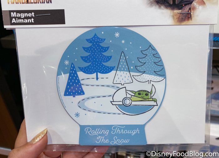 While we were at D-Tech we spotted some NEW Baby Yoda Holiday Magnets! There’s this one that says “Rolling Through the Snow” (we see what you did there Disney) for $14.99…