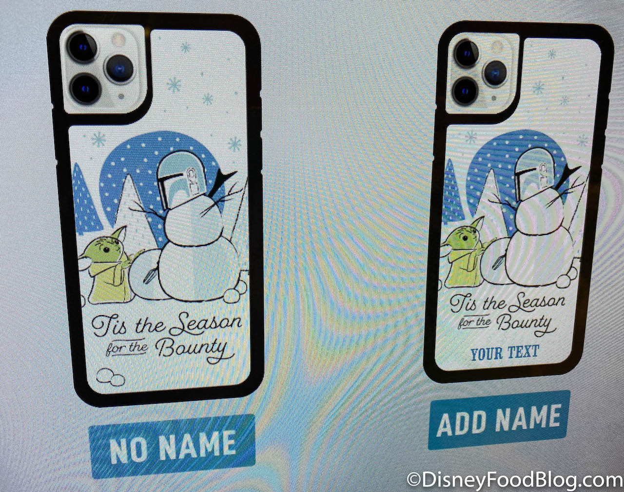 But that’s not all! We had already seen some Baby Yoda holiday phone cases in EPCOT, but we also found this “Tis the Season for the Bounty” case in Disney Springs! We SO LOVE that the Mandalorian helmet is being used as the snowman head. And just look at how proud Baby Yoda looks of his creation. It’s almost too much holiday happiness to handle!