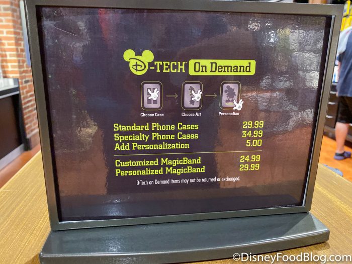 The price for a standard phone case from D-Tech is $29.99, with specialty phone cases costing $34.99, and personalizations priced at $5.00. You can see the prices for the customized and personalized MagicBands and the phone cases in the photo below.