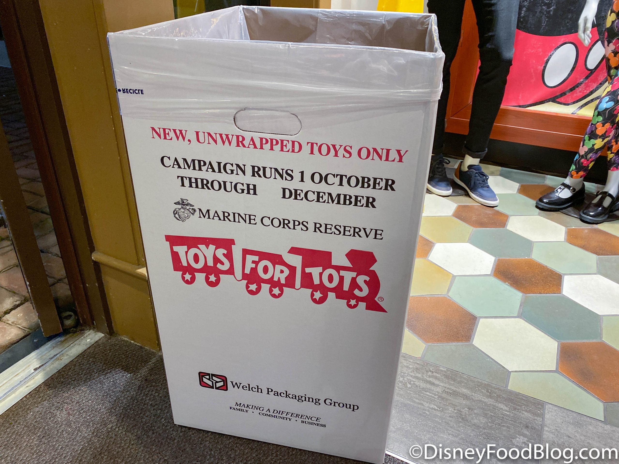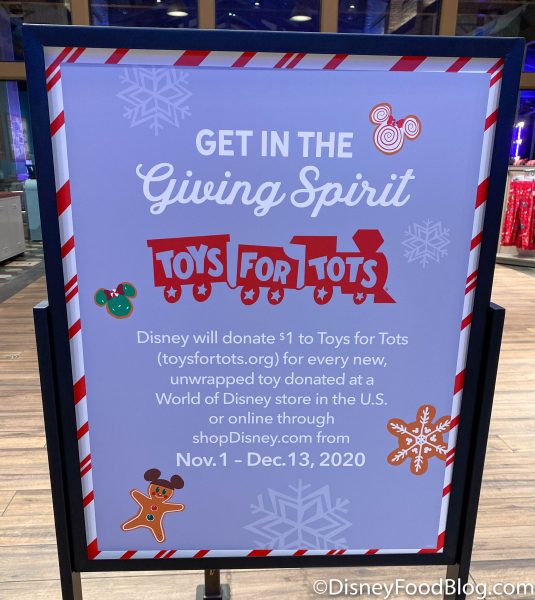 Finally, if you’re looking for a way to give back to others this holiday season, we saw a sign in World of Disney announcing that Disney will be donating $1 to Toys for Tots for every new, unwrapped toy you donate at a World of Disney store or online through December 13th.
