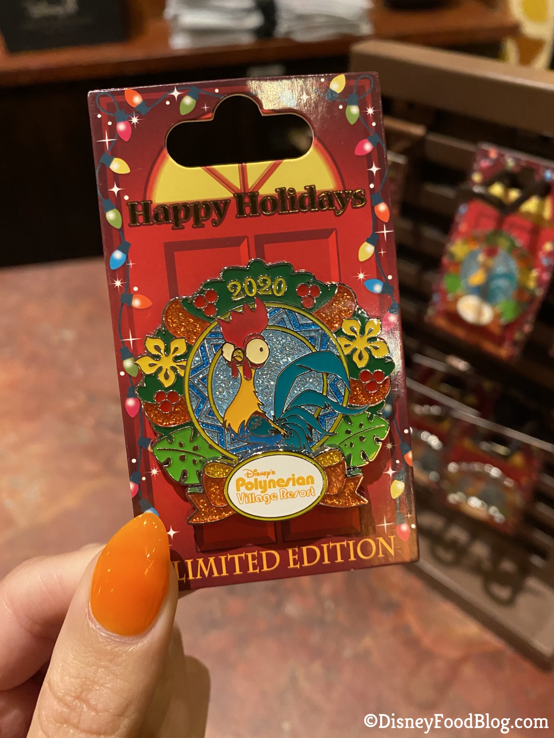 Not only did we spot the beloved Honolulu Cookies in Boutiki at Disney’s Polynesian Resort, but we also found a special holiday pin. This one features one of our favorite sidekicks, Hei Hei!