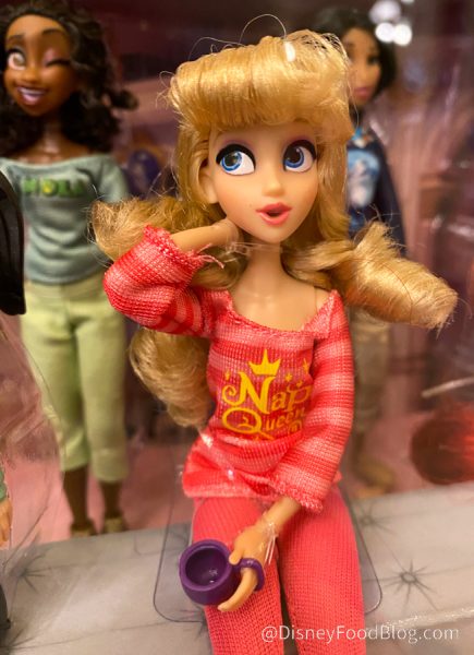 Then there’s the original Nap Queen herself, Aurora, with a cup of coffee in hand. Also, we see Tiana winking at us in the background!