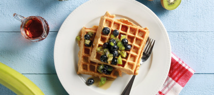 - Toss together blueberries, kiwi, and maple syrup for easy fruit compote. Serve over waffle sections.