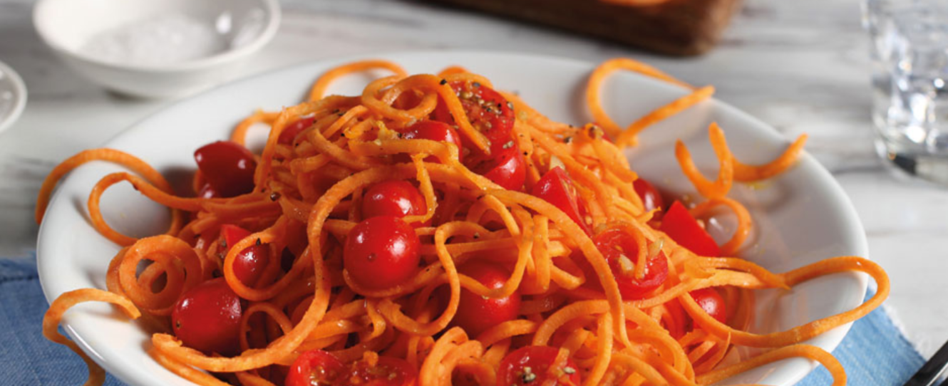 - If you don’t have a spiralizer, you can use a vegetable peeler – you’ll end up with fettuccine-width slices of sweet potato. Or, you can purchase pre-spiralized sweet potatoes.