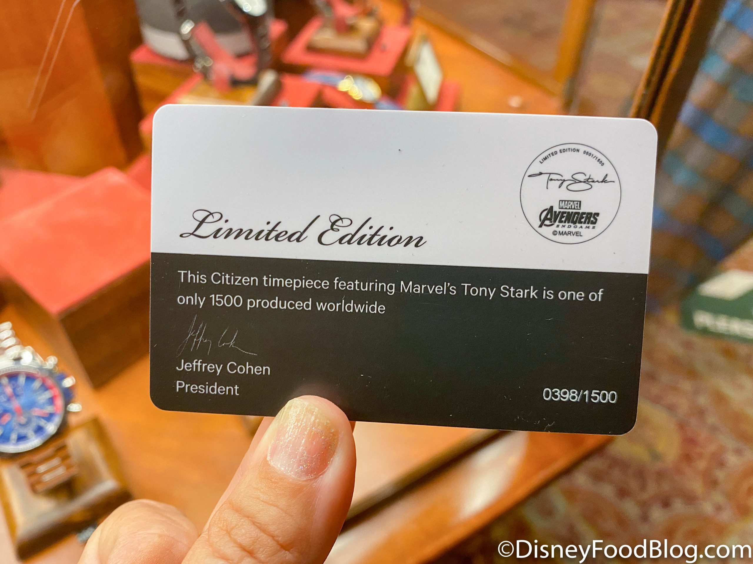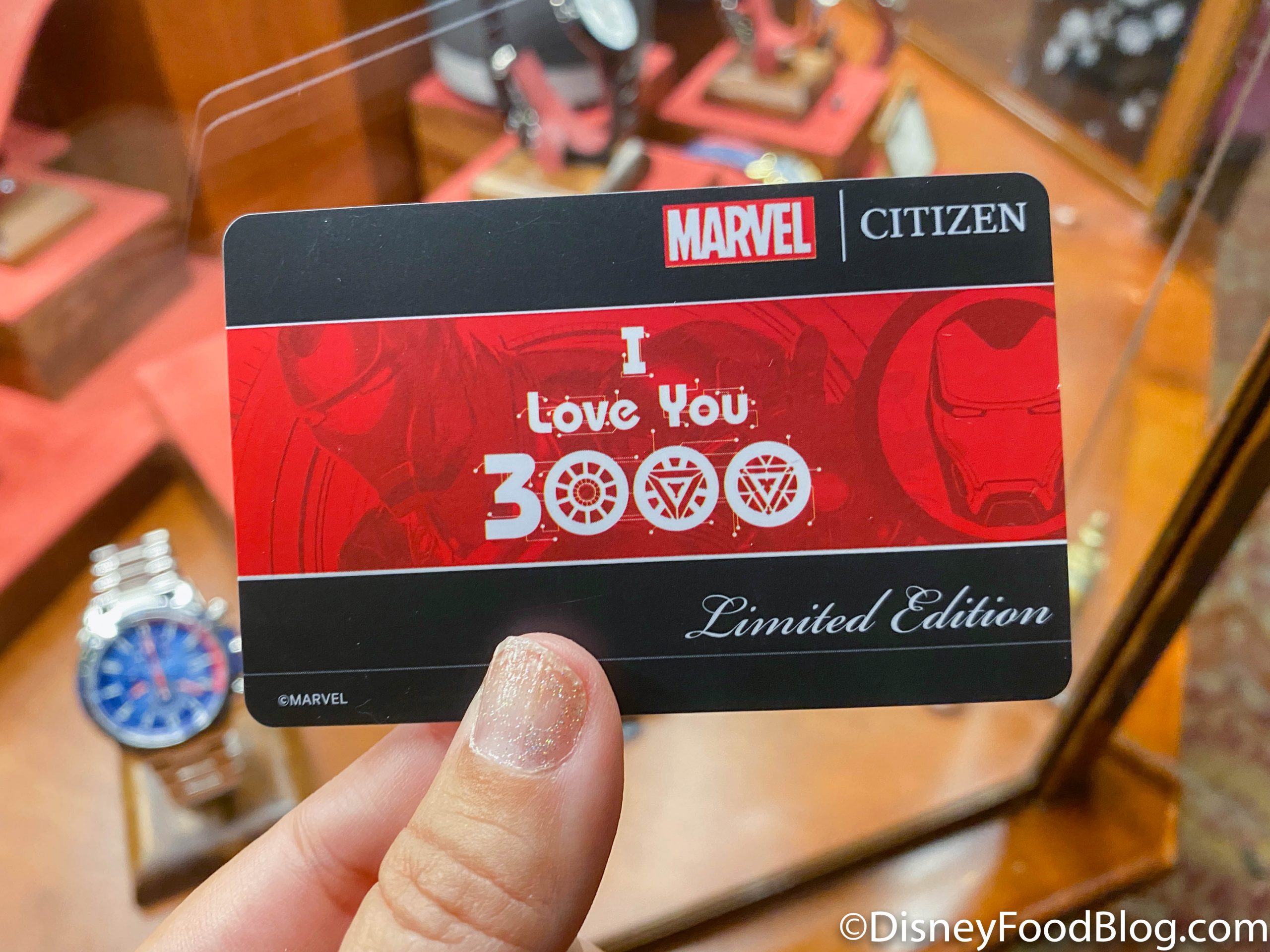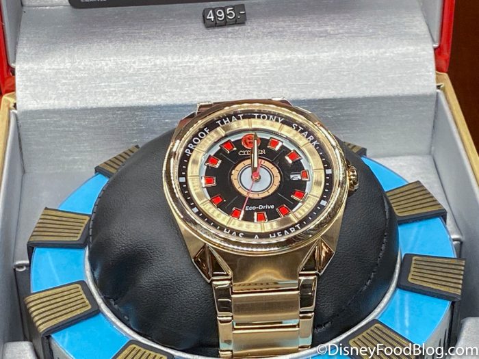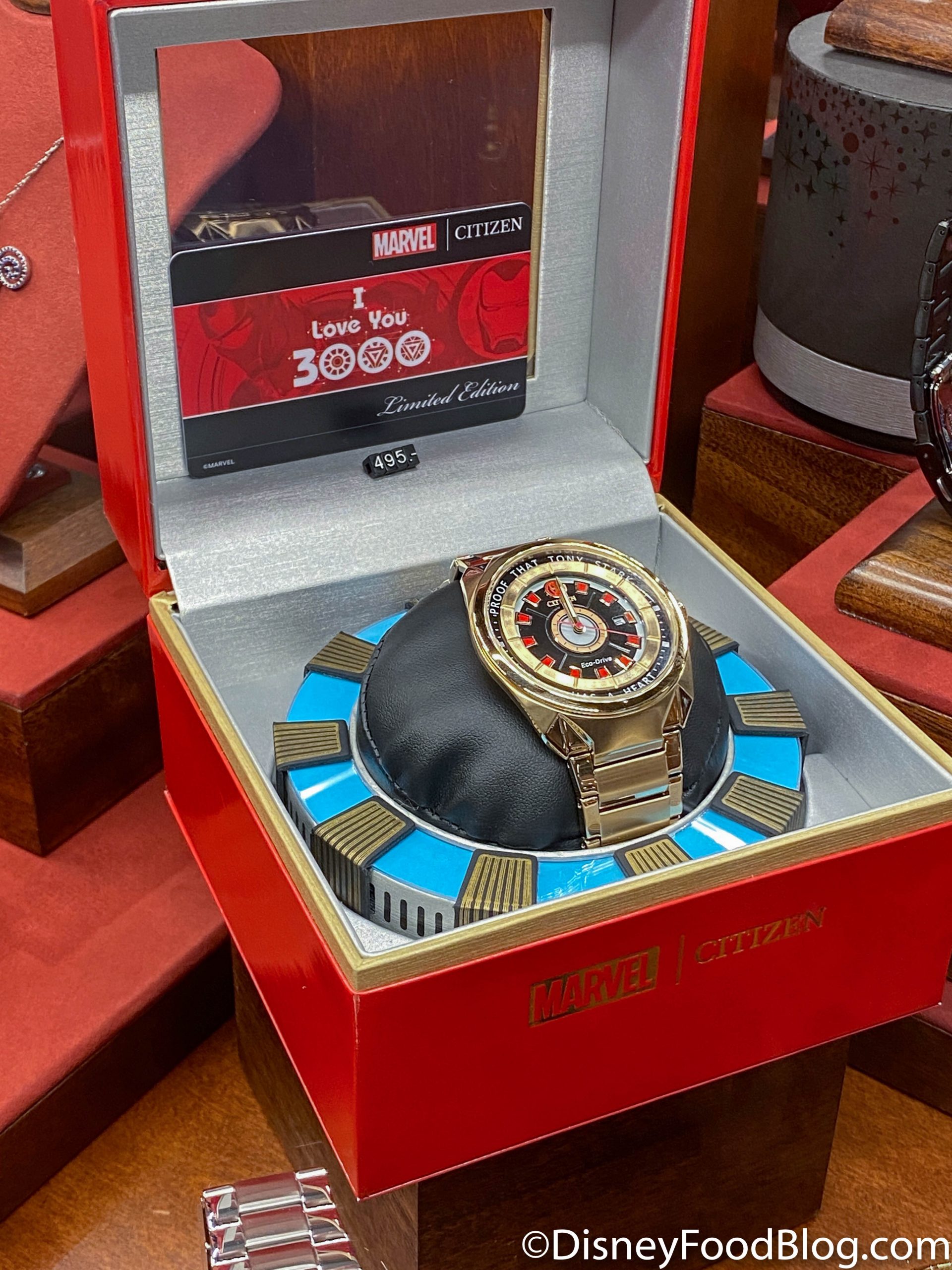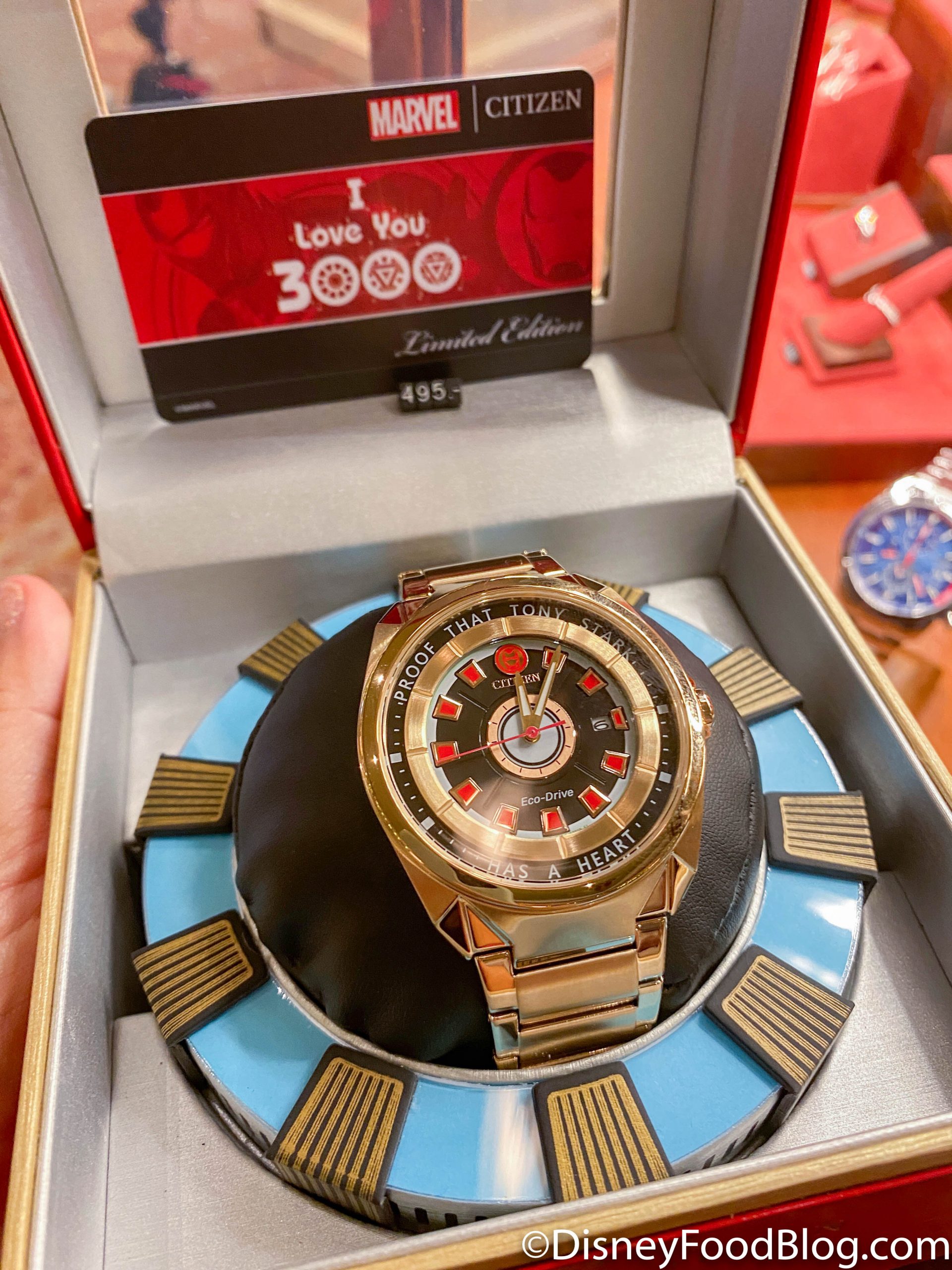 Today, as we made our way around Magic Kingdom (admiring all the holiday decor), we stopped by Uptown Jewelers. That’s where we found this INCREDIBLE Limited-Edition “I Love You 3000” Tony Stark Watch from Citizen.