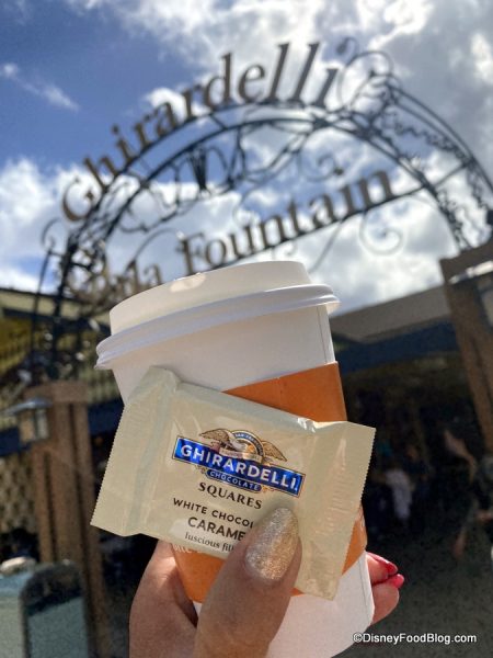 One of our stops today was Ghirardelli Soda Fountain & Chocolate Shop to try the new White Chocolate Caramel Steamer. Because… white chocolate caramel.