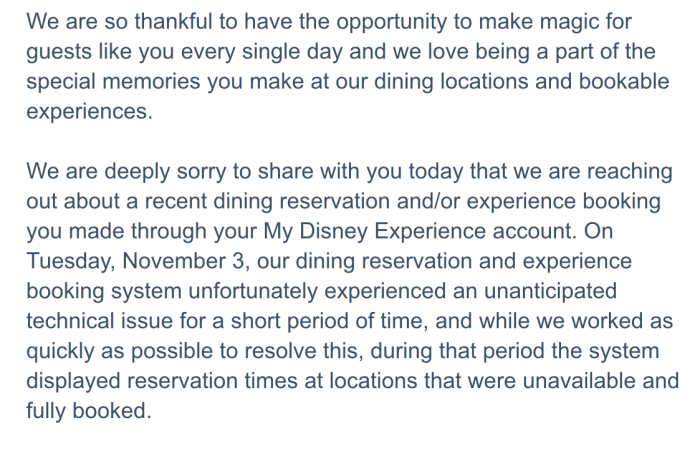 While we shared all of these details yesterday, Disney has now emailed guests impacted by this situation. It’s important to note that reservations made outside the glitch will not be changed or canceled.