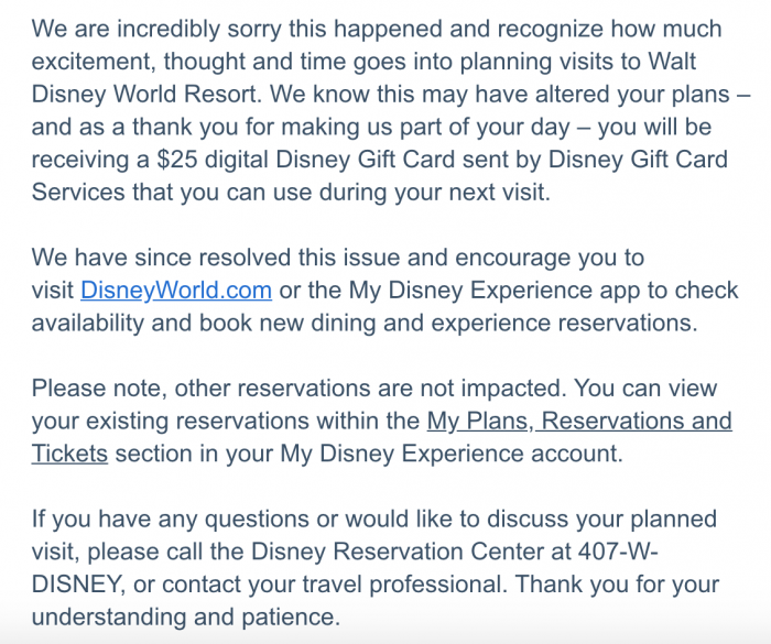 Due to this massive glitch, Disney has stated that the guests who were affected by these cancellations will receive a $25 digital Disney gift card to apologize for the inconvenience.