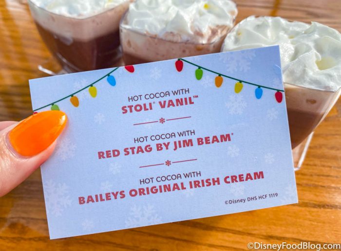 But we’re all about that hot cocoa. And we discovered that an old favorite has officially returned: the SPIKED Hot Cocoa Flight! This is a sampling of three yummy boozy hot chocolates: hot cocoa with Stoli Vanil, Red Stag by Jim Beam, and Bailey’s Original Irish Cream.
