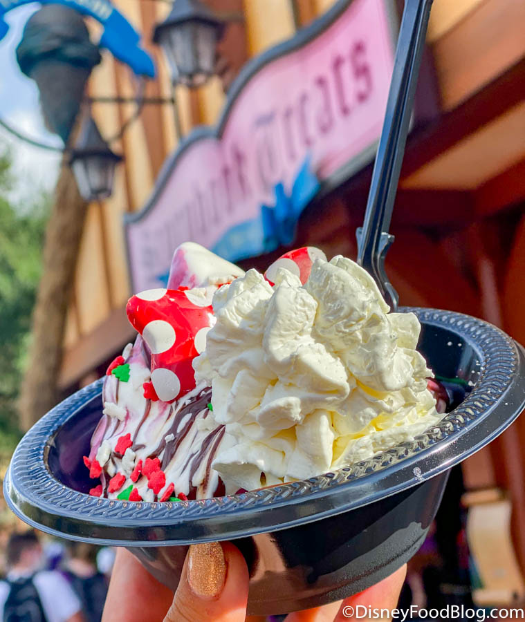 The vanilla soft-serve helps tone done the cherry flavor a bit, along with the helping of hot fudge and whipped cream on top. If you love treats that are a little more on tart side or you’re just a BIG fan of all things cherry, we think that Minnie Merry Cherry Sundae would be a great break from all the gingerbread or chocolate treats for $6.49.