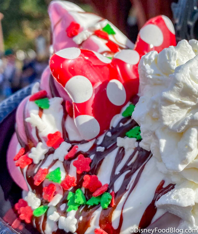However, Minnie’s Merry Cherry Sundae has the exact opposite flavors as its Halloween counterpart, combining up cherry and vanilla soft-serve with hot fudge, whipped cream, holiday sprinkles, and a chocolate Minnie bow on top.