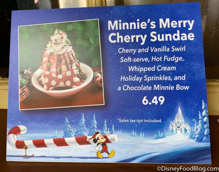Since Halloween is officially over in the parks, Storybook Treats has said goodbye to the Poor Unfortunate Soul Float and hello to the new Minnie’s Merry Cherry Sundae for the holidays instead!