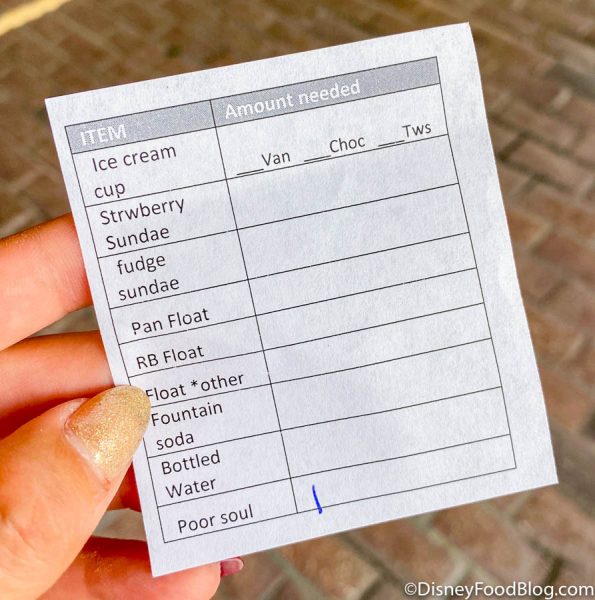 Today, guests who got in line could choose what item they would like ahead of time to keep up with distancing and health and safety measures at the quick-service location. Although Storybook has switched out its Halloween treat for a Christmas dessert, the order slip still stated the seasonal option as the “Poor Soul” Float (whoops!).