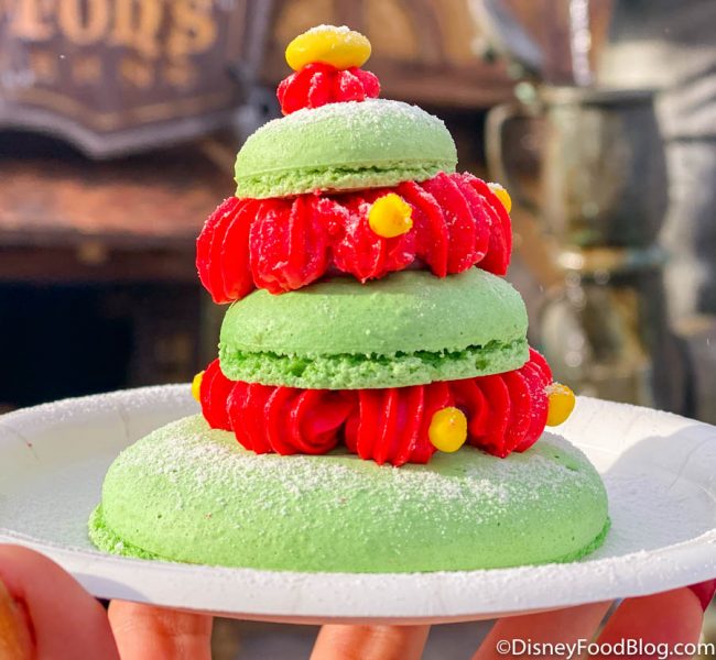 This treat is a stack of almond macarons (the green) with cranberry orange cream (the red), and a yellow M&M right on top!